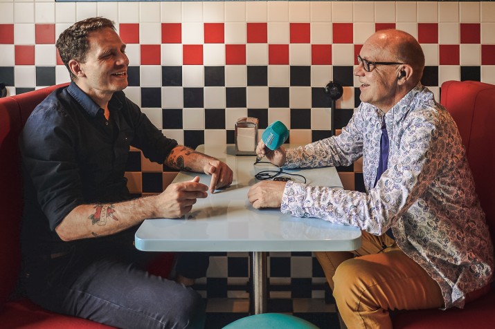 Oskar Kaszyński właściciel studia Panika w rozmowie z Włodkiem Raszkiewiczem w stylizowanej na lata 50. wyjątkowej kuchni (Fot. Jacek Klejment/Radio Gdańsk)